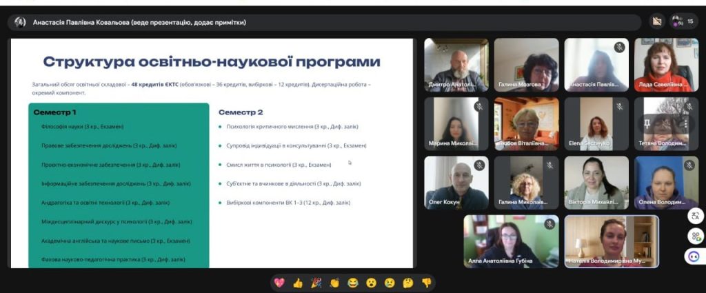 До обговорення долучилися науково-педагогічні працівники кафедри, здобувачі освіти та зовнішні стейкхолдери, що дозволило забезпечити комплексний підхід до вдосконалення програми з урахуванням сучасних тенденцій розвитку психологічної науки та практики.